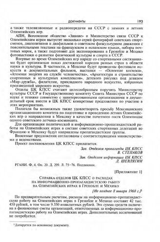 Приложение 1 к записке отделов ЦК КПСС. Справка отделов ЦК КПСС о расходах на информационно-пропагандистскую работу на Олимпийских играх в Гренобле и Мехико. [Не позднее 8 января 1968 г.]