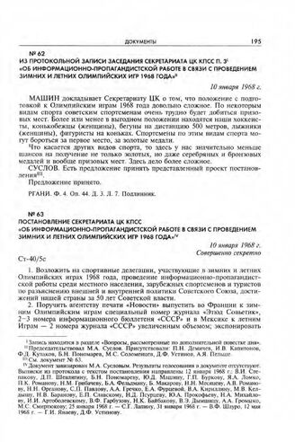 Постановление Секретариата ЦК КПСС «Об информационно-пропагандистской работе в связи с проведением зимних и летних Олимпийских игр 1968 года». 10 января 1968 г.