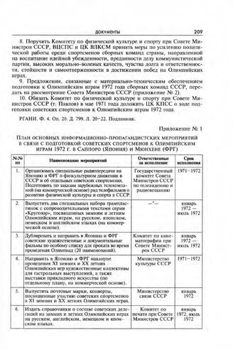 Приложение № 1 к постановлению Секретариата ЦК КПСС. План основных информационно-пропагандистских мероприятий в связи с подготовкой советских спортсменов к Олимпийским играм 1972 г. в Саппоро (Япония) и Мюнхене (ФРГ)