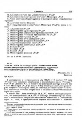 Записка Отдела пропаганды ЦК КПСС о некоторых мерах по материально-техническому обеспечению подготовки советских спортсменов к Олимпийским играм 1972 г. 22 января 1971 г. // РГАНИ. Ф. 4. Оп. 20. Д. 829. Л. 107-108. Подлинник.
