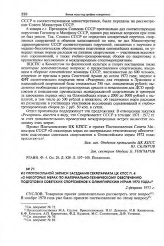 Из протокольной записи заседания Секретариата ЦК КПСС п. 4 «О некоторых мерах по материально-техническому обеспечению подготовки советских спортсменов к Олимпийским играм 1972 года». 2 февраля 1971 г.
