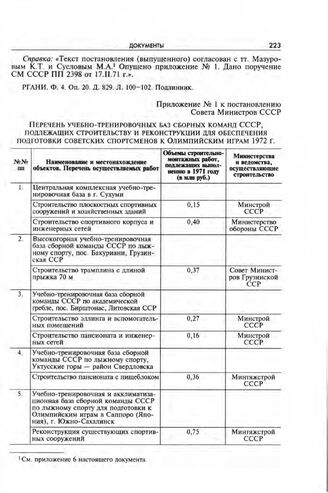 Приложение № 1 к проекту постановления Совета Министров СССР. Перечень учебно-тренировочных баз сборных команд СССР, подлежащих строительству и реконструкции для обеспечения подготовки советских спортсменов к Олимпийским играм 1972 г.
