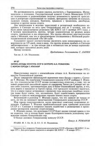 Запись беседы консула СССР в Саппоро А.Н. Романова с мэром города Т. Итагаки. 12 января 1972 г.