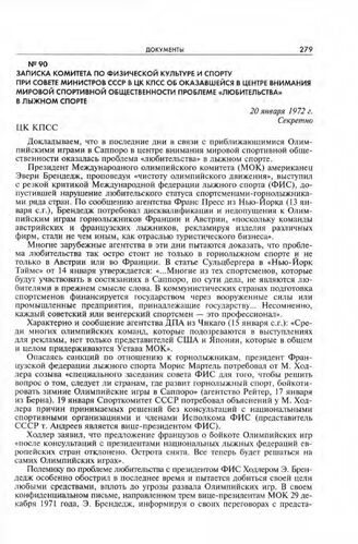 Записка Комитета по физической культуре и спорту при Совете Министров СССР в ЦК КПСС об оказавшейся в центре внимания мировой спортивной общественности проблеме «любительства» в лыжном спорте. 20 января 1972 г.