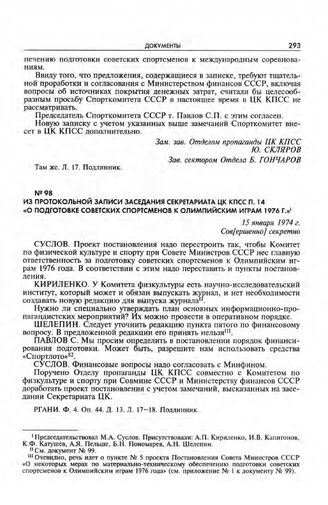 Из протокольной записи заседания Секретариата ЦК КПСС п. 14 «О подготовке советских спортсменов к Олимпийским играм 1976 г.». 15 января 1974 г. // РГАНИ. Ф. 4. Оп. 44. Д. 13. Л. 17-18. Подлинник.