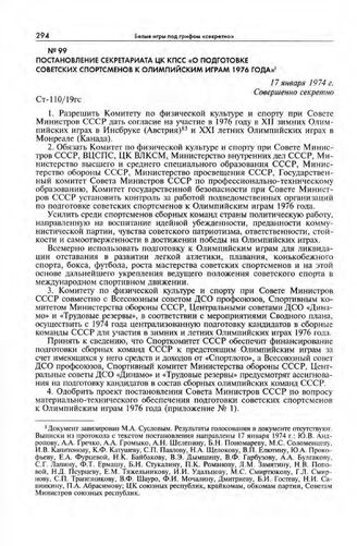 Постановление Секретариата ЦК КПСС «О подготовке советских спортсменов к Олимпийским играм 1976 года». 17 января 1974 г.