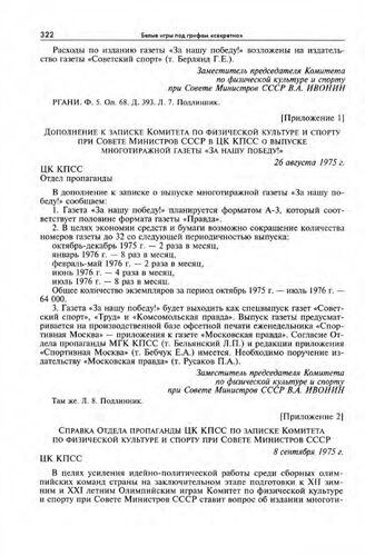 Приложение 2 к записке Комитета по физической культуре и спорту при Совете Министров СССР в ЦК КПСС. Справка Отдела пропаганды ЦК КПСС по записке Комитета по физической культуре и спорту при Совете Министров СССР. 8 сентября 1975 г.