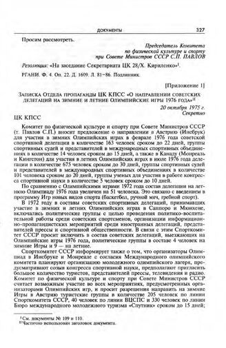 Приложение 1 к информации Комитета по физической культуре и спорту при Совете Министров СССР в ЦК КПСС. Записка Отдела пропаганды ЦК КПСС «О направлении советских делегаций на зимние и летние Олимпийские игры 1976 года». 20 октября 1975 г. // РГАНИ. Ф. 4. Оп. 22. Д. 1609. Л. 76-78. Подлинник.