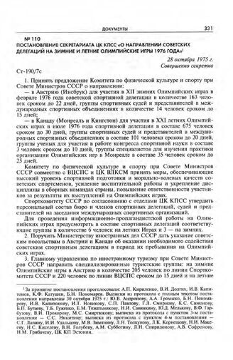Постановление Секретариата ЦК КПСС «О направлении советских делегаций на зимние и летние Олимпийские игры 1976 года». 28 октября 1975 г.