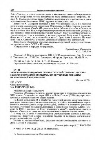 Записка главного редактора газеты «Советский спорт» Н.С. Киселева в ЦК КПСС о направлении специальных корреспондентов газеты на XIII Олимпийские игры 1980 г. 30 июля 1979 г.