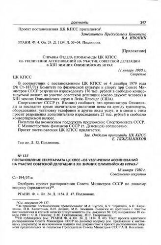 Постановление Секретариата ЦК КПСС «Об увеличении ассигнований на участие советской делегации в XIII зимних Олимпийских играх». 18 января 1980 г.
