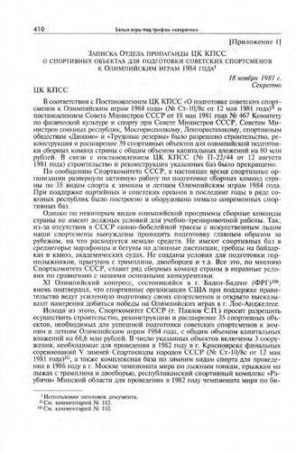 Приложение 1 к постановлению Секретариата ЦК КПСС. Записка Отдела пропаганды ЦК КПСС о спортивных объектах для подготовки советских спортсменов к Олимпийским играм 1984 года. 18 ноября 1981 г. // РГАНИ. Ф. 4. Оп. 28. Д. 206. Л. 70-72. Подлинник.