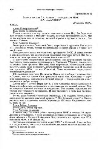 Приложение 1 к записке Комитета по физической культуре и спорту при Совете Министров СССР в ЦК КПСС. Запись беседы Г.А. Алиева с президентом МОК Х.А. Самаранчем. 20 декабря 1982 г.