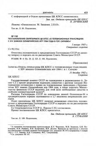 Приложение к постановлению Секретариата ЦК КПСС. Записка Отдела пропаганды ЦК КПСС о телевизионных трансляциях с XIV зимних Олимпийских игр 1984 г. в г. Сараево. 31 декабря 1982 г. // РГАНИ. Ф. 4. Оп. 28. Д. 523. Л. 109. Подлинник.