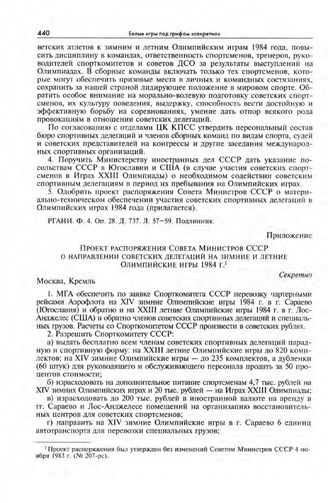 Приложение к постановлению Секретариата ЦК КПСС. Проект распоряжения Совета Министров СССР о направлении советских делегаций на зимние и летние Олимпийские игры 1984 г.