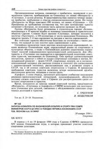 Записка Комитета по физической культуре и спорту при Совете Министров СССР в ЦК КПСС о поездке летчика-космонавта СССР тов. Леонова А.А. в СФРЮ. 30 января 1984 г.