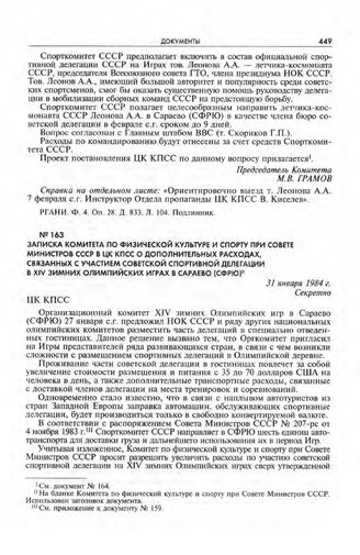 Записка Комитета по физической культуре и спорту при Совете Министров СССР в ЦК КПСС о дополнительных расходах, связанных с участием советской спортивной делегации в XIV зимних Олимпийских играх в Сараево (СФРЮ). 31 января 1984 г.