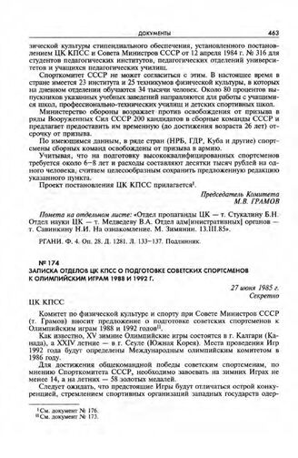 Записка отделов ЦК КПСС о подготовке советских спортсменов к Олимпийским играм 1988 и 1992 г. 27 июня 1985 г. // РГАНИ. Ф. 4. Оп. 28. Д. 1281. Л. 125-128. Подлинник.