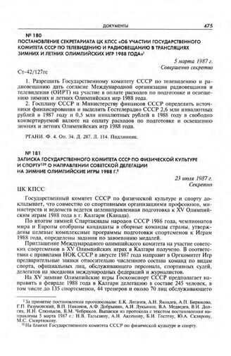 Постановление Секретариата ЦК КПСС «Об участии Государственного комитета СССР по телевидению и радиовещанию в трансляциях зимних и летних Олимпийских игр 1988 года». 5 марта 1987 г.