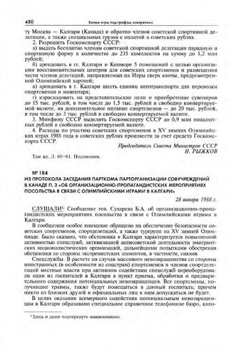 Из протокола заседания парткома парторганизации совучреждений в Канаде п. 3 «Об организационно-пропагандистских мероприятиях Посольства в связи с Олимпийскими играми в Калгари». 28 января 1988 г. // РГАНИ. Ф. 5. Оп. 96. Д. 158. Л. 98-100. Подлинник.