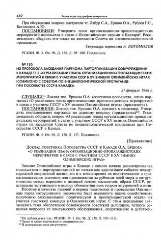 Приложение к протоколу заседания парткома парторганизации совучреждений в Канаде. Доклад советника Посольства СССР в Канаде О.А. Ершова «О реализации плана организационно-пропагандистских мероприятий в связи с участием СССР в XV зимних Олимпийских играх»