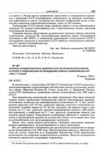Записка Государственного комитета СССР по физической культуре и спорту о предложении по проведению зимних Олимпийских игр 1998 г. в СССР. 28 апреля 1989 г.