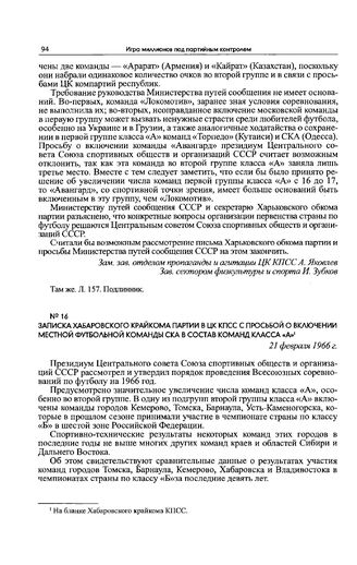 Записка Хабаровского крайкома партии в ЦК КПСС с просьбой о включении местной футбольной команды СКА в состав команд класса «А». 21 февраля 1966 г. // РГАНИ. Ф. 5. Оп. 33. Д. 240. Л. 26-28. Подлинник.