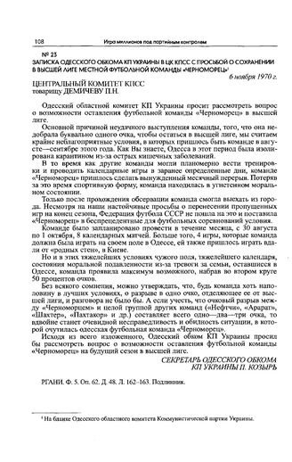 Записка Одесского обкома КП Украины в ЦК КПСС с просьбой о сохранении в высшей лиге местной футбольной команды «Черноморец». 6 ноября 1970 г.