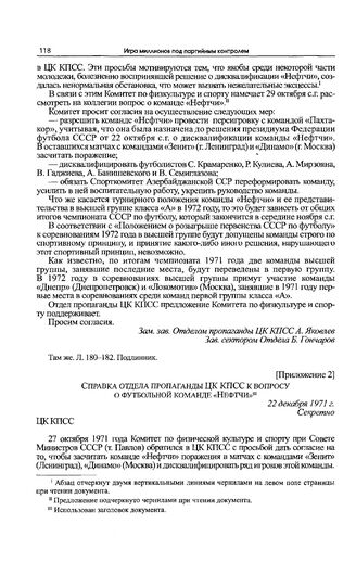 Приложение 2 к записке Спорткомитета СССР в ЦК КПСС. Справка отдела пропаганды ЦК КПСС к вопросу о футбольной команде «Нефтчи». 22 декабря 1971 г. // РГАНИ. Ф. 5. Оп. 63. Д. 102. Л. 183. Подлинник.