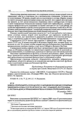 Записка Спорткомитета СССР в ЦК КПСС о нарушении Положения о розыгрыше чемпионата и Кубка СССР по футболу на 1980 г. командой «Ростсельмаш» (г. Ростов-на-Дону) и Управлением футбола и хоккея Спорткомитета РСФСР. 30 октября 1980 г. // РГАНИ. Ф. 5. Оп. 77. Д. 149. Л. 124-125. Подлинник.