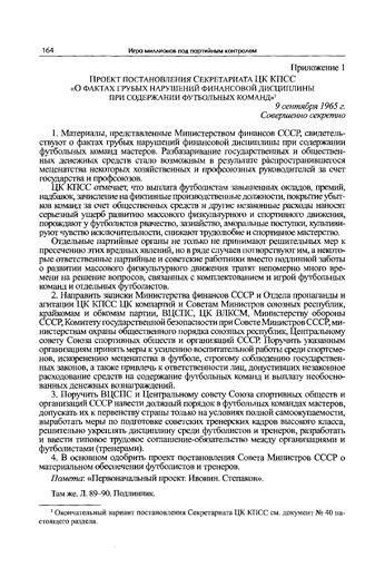 Приложение 1 к записке отдела пропаганды и агитации ЦК КПСС. Проект постановления Секретариата ЦК КПСС «О фактах грубых нарушений финансовой дисциплины при содержании футбольных команд». 9 сентября 1965 г. // РГАНИ. Ф. 4. Оп. 18. Д. 929. Л. 89-90. Подлинник.