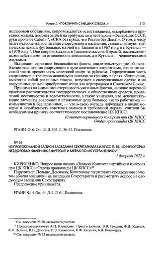 Из протокольной записи заседания Секретариата ЦК КПСС. П. 10. «О некоторых нездоровых явлениях в футболе и мерах по их устранению». 1 февраля 1972 г. // РГАНИ. Ф. 4. Оп. 44. Д. 9. Л. 61. Подлинник.