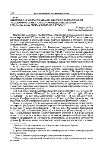 Информация ЦК компартии Украины в ЦК КПСС о ходе выполнения постановления ЦК КПСС «О некоторых нездоровых явлениях в отдельных видах спорта и особенно в футболе». 27 апреля 1974 г.