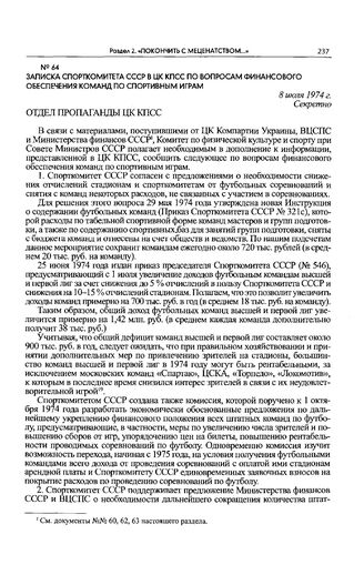 Записка Спорткомитета СССР в ЦК КПСС по вопросам финансового обеспечения команд по спортивным играм. 8 июля 1974 г. // РГАНИ. Ф. 5. Оп. 67. Д. 127. Л. 71-76. Подлинник.