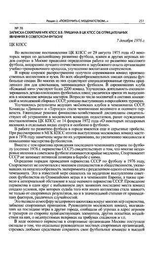 Записка секретаря МГК КПСС В.В. Гришина в ЦК КПСС об отрицательных явлениях в советском футболе. 7 декабря 1976 г.