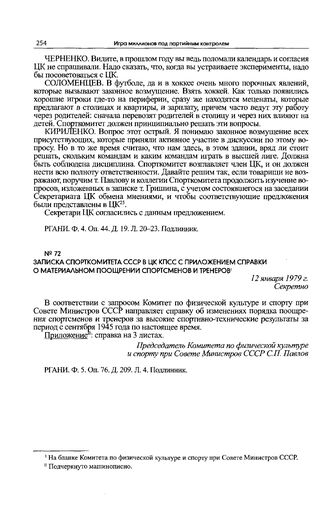 Записка Спорткомитета СССР в ЦК КПСС с приложением справки о материальном поощрении спортсменов и тренеров. 12 января 1979 г.