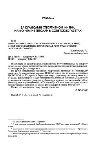 Записка главного редактора газеты «Правда» Л.З. Мехлиса в ЦК ВКП(б) и НКВД СССР об обстановке вокруг визита в Ленинград испанской футбольной команды. 16 августа 1937 г. // РГАНИ. Ф. 3. Оп. 36. Д. 33. Л. 76. Подлинник.