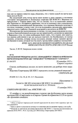 Приложение 1 к постановлению Президиума ЦК КПСС. Записка ЦК КП Армении в ЦК КПСС об инциденте на футбольном матче в г. Ереване. 15 октября 1955 г. // РГАНИ. Ф. 3. Оп. 36. Д. 13. Л. 133-134. Подлинник.