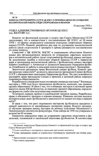 Записка Спорткомитета СССР в ЦК КПСС о принятых мерах по улучшению воспитательной работы среди спортсменов и тренеров. 16 августа 1958 г. // РГАНИ. Ф. 5. Оп. 47. Д. 276. Л. 69-71. Подлинник.