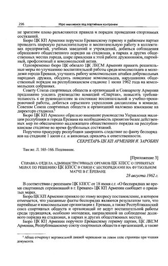Приложение 3 к постановлению Секретариата ЦК КПСС. Справка отдела административных органов ЦК КПСС о принятых мерах по решению ЦК КПСС в связи с беспорядками на футбольном матче в г. Ереване. 28 августа 1962 г. // РГАНИ. Ф. 4. Оп. 18. Д. 167. Л. 164. Подлинник.