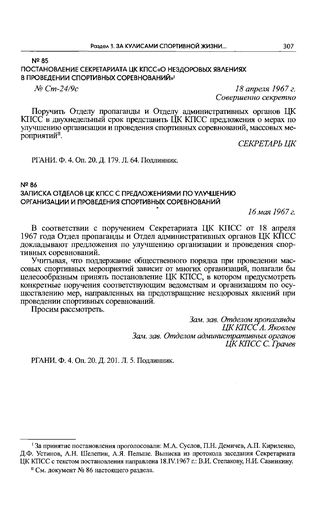 Постановление Секретариата ЦК КПСС «О нездоровых явлениях в проведении спортивных соревнований». 18 апреля 1967 г.