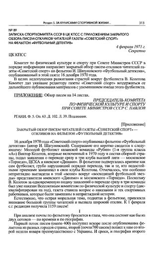 Приложение к записке Спорткомитета СССР в ЦК КПСС. Закрытый обзор писем читателей газеты «Советский спорт» — откликов на фельетон «Футбольный детектив»