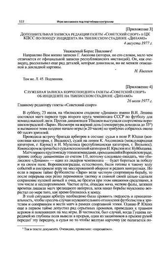Приложение 3 к записке редакции газеты «Советский спорт» в ЦК КПСС. Дополнительная записка редакции газеты «Советский спорт» в ЦК КПСС по поводу инцидента на тбилисском стадионе «Динамо». 4 августа 1977 г.