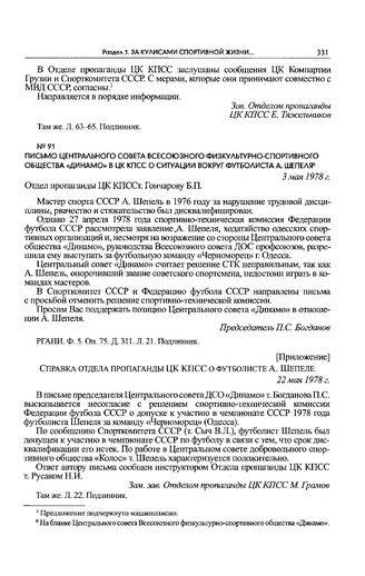 Приложение к письму Центрального совета Всесоюзного физкультурно-спортивного общества «Динамо» в ЦК КПСС. Справка отдела пропаганды ЦК КПСС о футболисте А. Шепеле. 22 мая 1978 г. // РГАНИ. Ф. 5. Оп. 75. Д. 311. Л. 22. Подлинник.