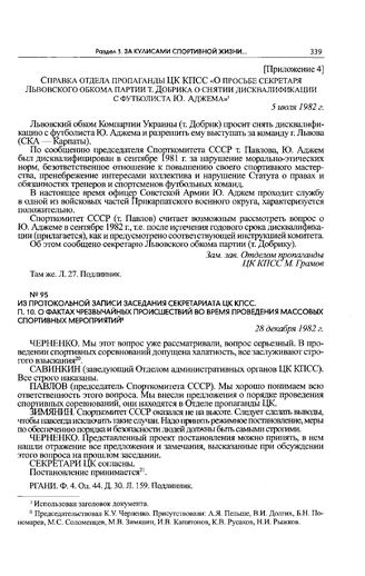 Из протокольной записи заседания Секретариата ЦК КПСС. П. 10. О фактах чрезвычайных происшествий во время проведения массовых спортивных мероприятий. 28 декабря 1982 г. // РГАНИ. Ф. 4. Оп. 44. Д. 30. Л. 159. Подлинник.