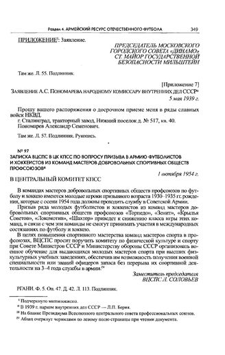 Записка ВЦСПС в ЦК КПСС по вопросу призыва в армию футболистов и хоккеистов из команд мастеров добровольных спортивных обществ профсоюзов. 1 октября 1954 г. // РГАНИ. Ф. 5. Оп. 47. Д. 42. Л. 113. Подлинник.