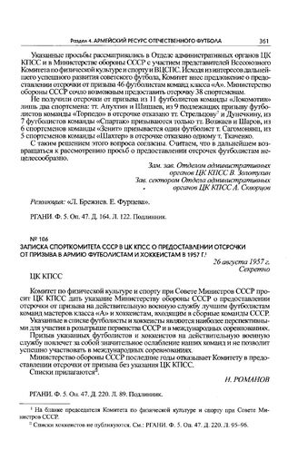 Записка Спорткомитета СССР в ЦК КПСС о предоставлении отсрочки от призыва в армию футболистам и хоккеистам в 1957 г. 26 августа 1957 г. // РГАНИ. Ф. 5. Оп. 47. Д. 220. Л. 89. Подлинник.