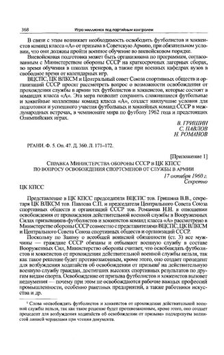 Приложение 1 к записке ВЦСПС, ЦК ВЛКСМ и Спорткомитета СССР в ЦК КПСС. Справка Министерства обороны СССР в ЦК КПСС по вопросу освобождения спортсменов от службы в армии. 17 октября 1960 г.