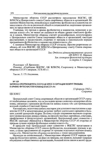 Записка Спорткомитета СССР в ЦК КПСС о ситуации вокруг призыва в армию футболистов команд класса «А». 13 февраля 1962 г.