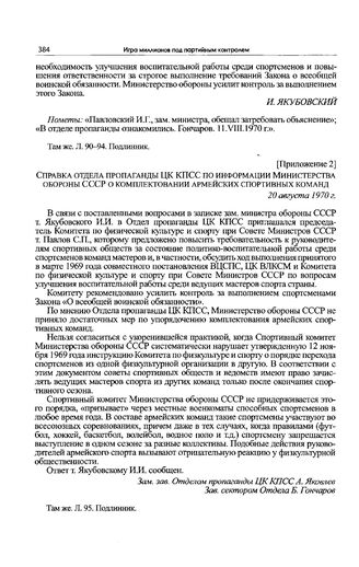 Приложение 2 к записке отдела пропаганды ЦК КПСС. Справка отдела пропаганды ЦК КПСС по информации Министерства обороны СССР о комплектовании армейских спортивных команд. 20 августа 1970 г.